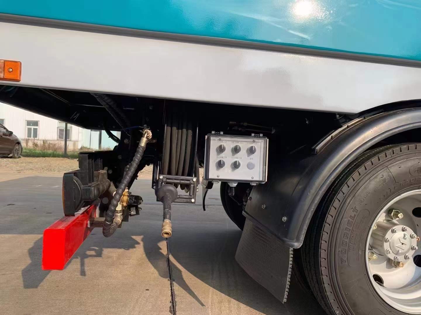側防護采用Q235,螺栓連接;后防護采用Q235,焊接連接,后防護截面高度尺寸120mm,截面寬度尺寸50mm,下邊緣離地高度360mm;裝液壓制動系統時,ABS及其控制器型號/生產企業對應關系為::APG3550500A/浙江亞太機電股份有限公司,CM4YL/廣州瑞立科密汽車電子股份有限公司;裝氣壓制動系統時,ABS及其控制器型號/生產企業對應關系為:CM4XL-4S/4M/廣州瑞立科密汽車電子股份有限公司;該車專用裝置主要由箱體和吸塵系統組成,用于路面吸塵作業.