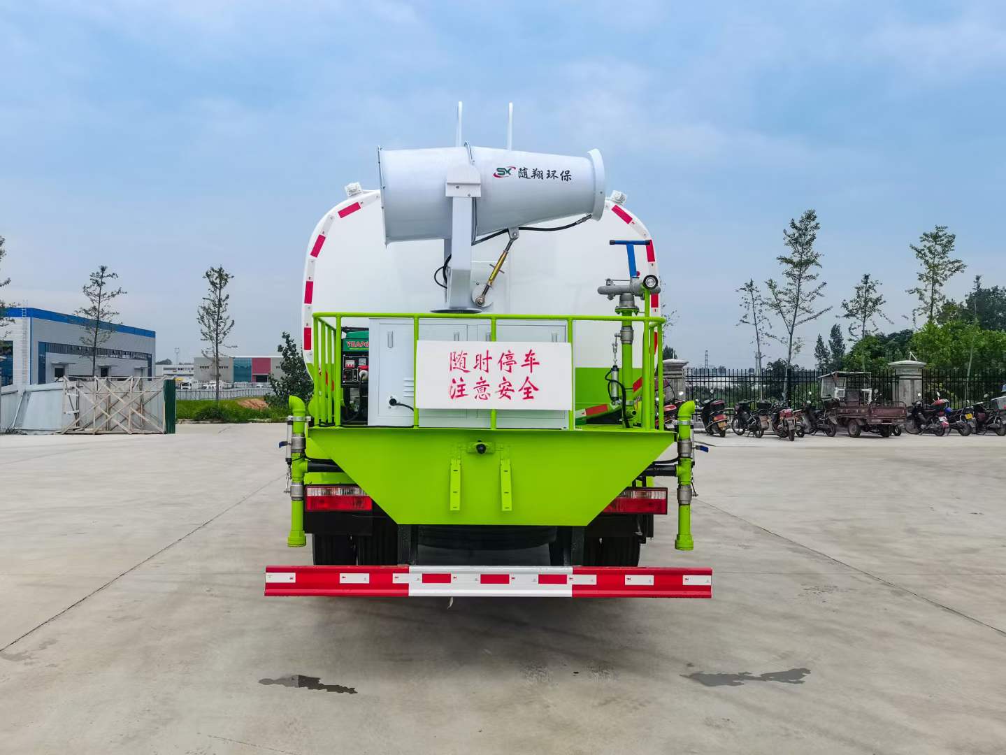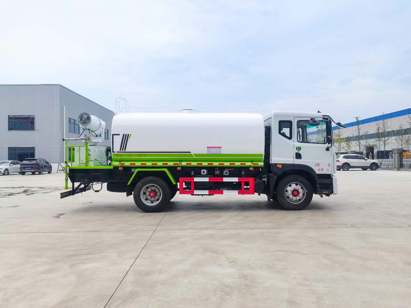 標(biāo)配:前沖、后灑、側(cè)噴、后平臺(tái)高炮、自流閥、消防接頭、濾網(wǎng)、噴頭、帶自吸自排。
