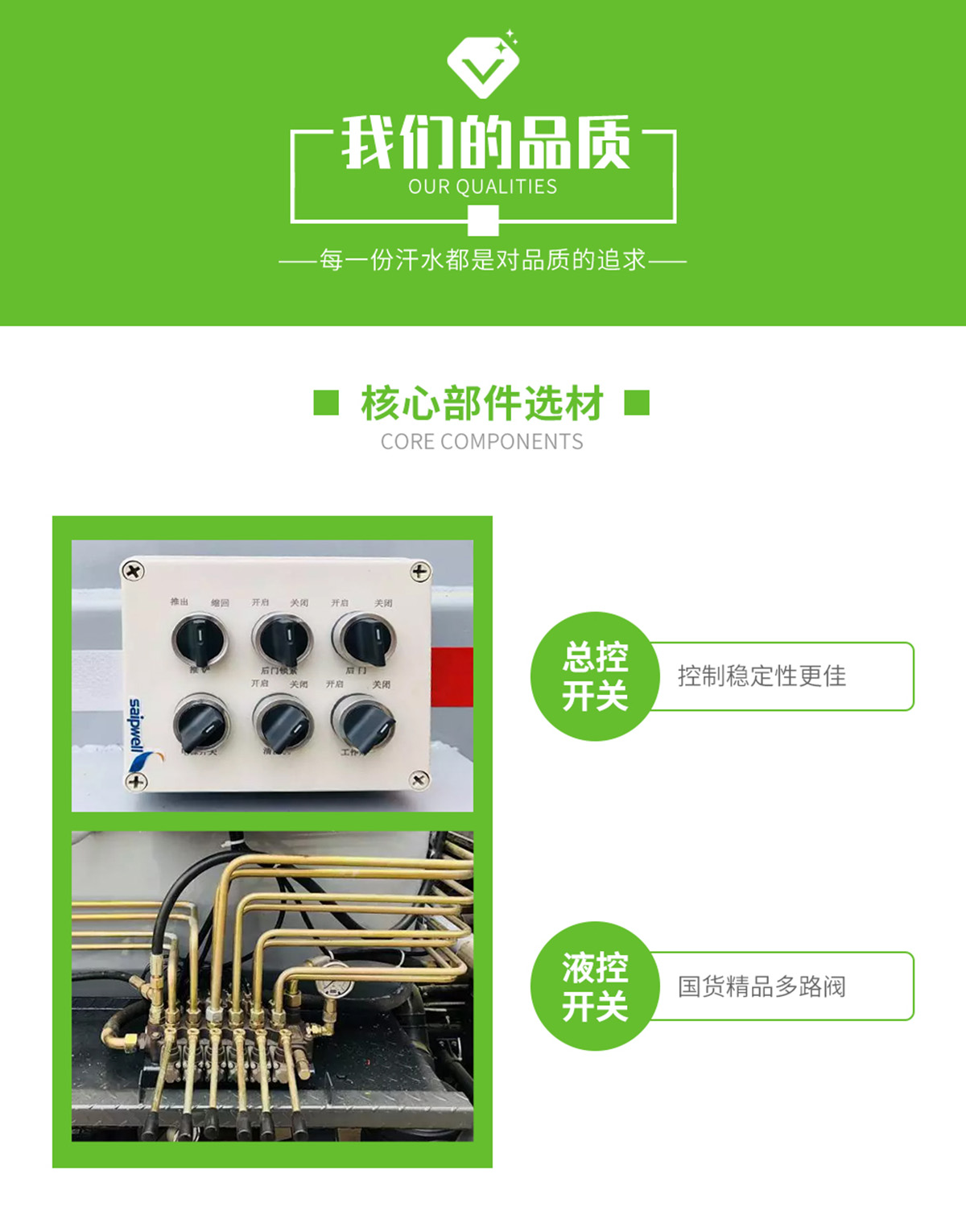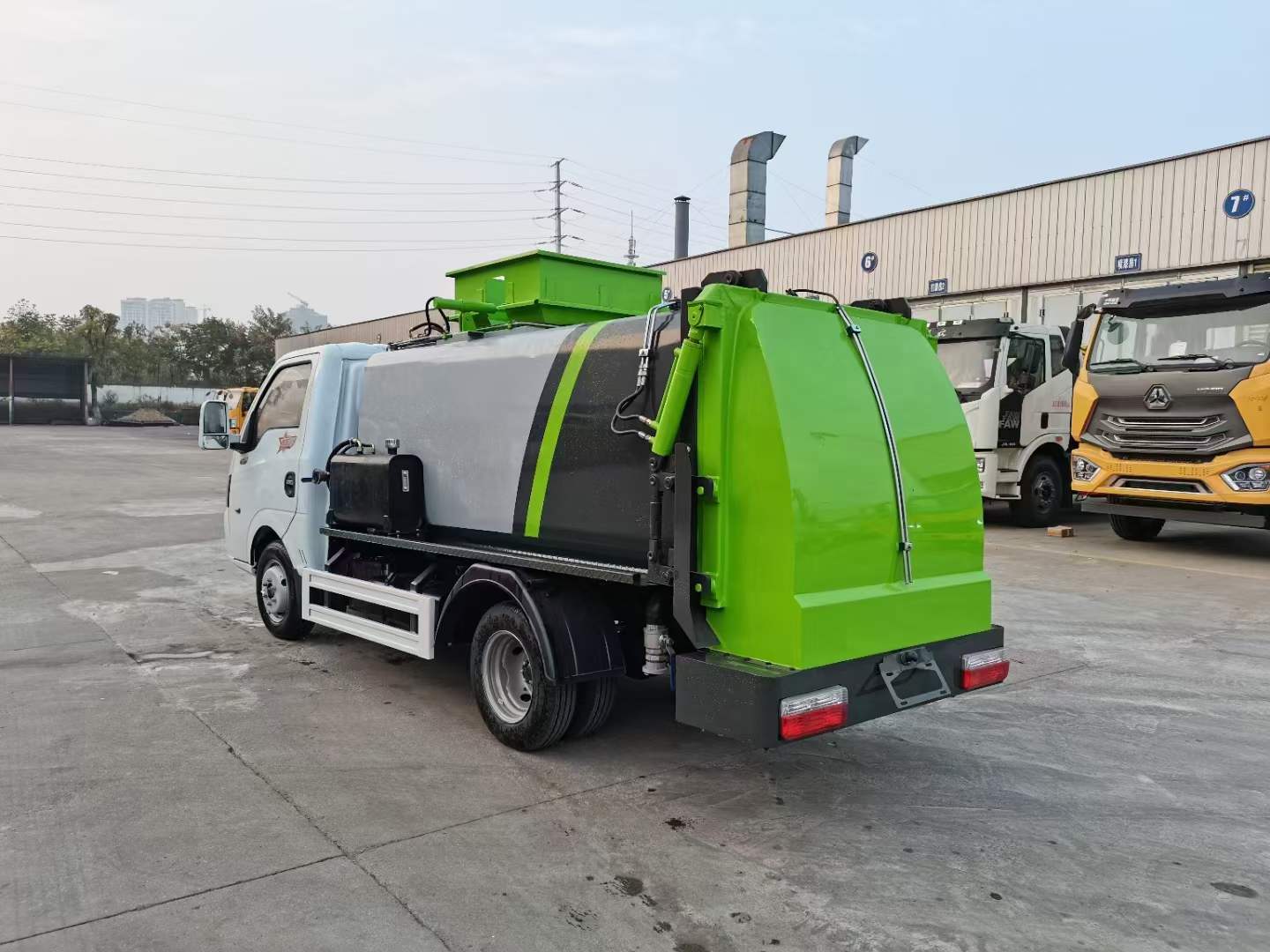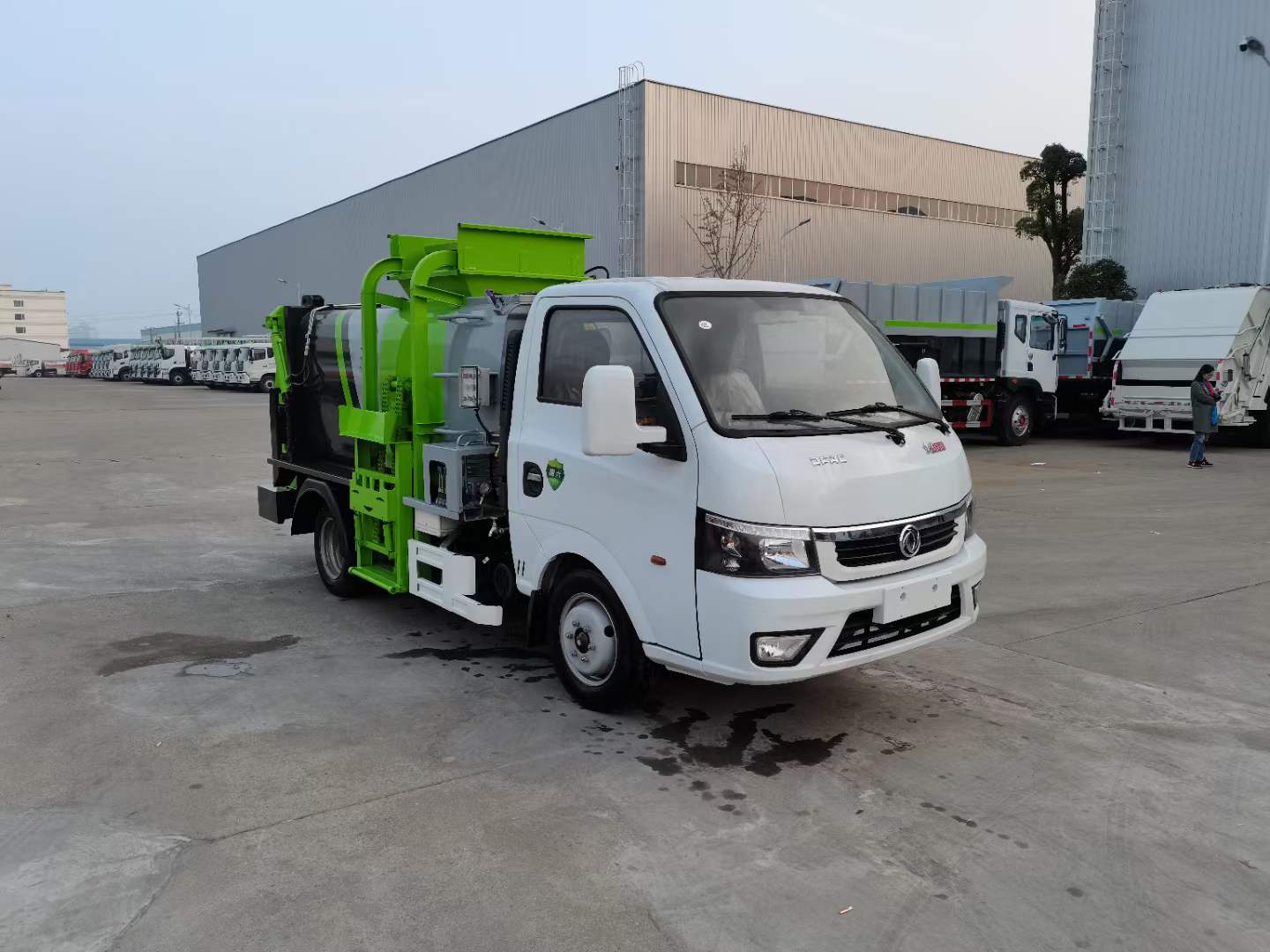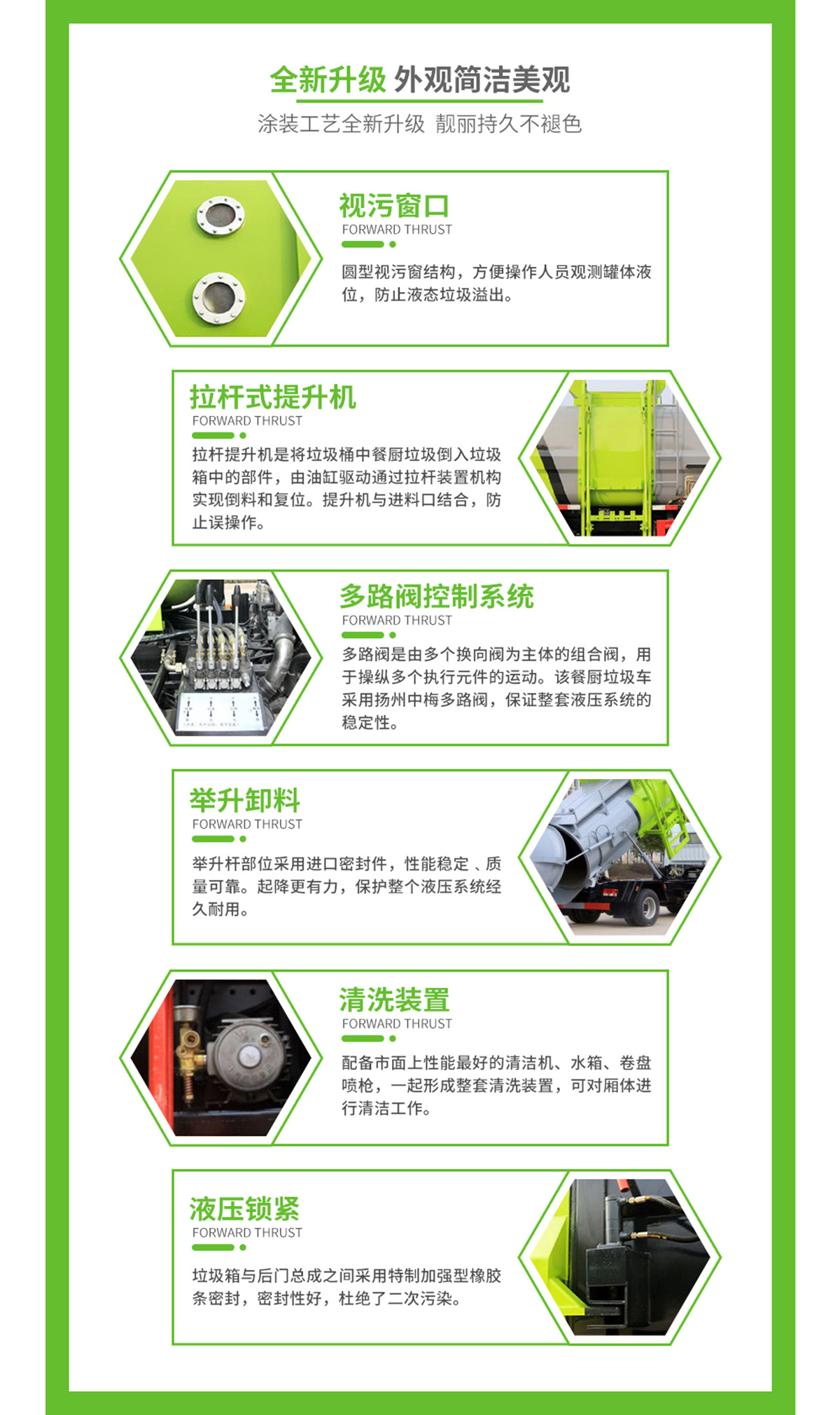 底盤配置:東風途逸(國六)軸距:2800mm,1650/單排,全柴Q23-95E60(95馬力),5檔變速箱,185R14真空輪胎-后雙輪,前后橋1.5/3。標配動力轉向,前盤制動,中控門鎖,電動門窗,定速巡航,藍牙電話,LED日間行車燈,ABS,空調,預留取力器窗口。上裝配置:箱體采用T700高強度耐厚鋼,邊2底2,容積4立方,嘉善取力器,合肥油泵;江蘇多路閥;國產液壓油缸;帶推鏟卸料功能(不帶舉升),擠壓干濕分離,尾部大梁上左右各安裝一個出口帶消防接口;液壓后蓋,后蓋帶密封條,后蓋液壓鎖緊;雙鏈條提升機;可掛120/240L標準塑料垃圾桶;駕駛室內集中電控(提升機外部手動控制);后門鎖緊與后蓋開關的操作具有防誤操作,提升機與上蓋、推鏟具有防誤操作;帶高壓清洗功能,液壓馬達,清洗泵,自回位巻盤,水槍;車身高位示廓燈/邊燈/作業照明燈。電控操作功能。可選裝遙控器操作。