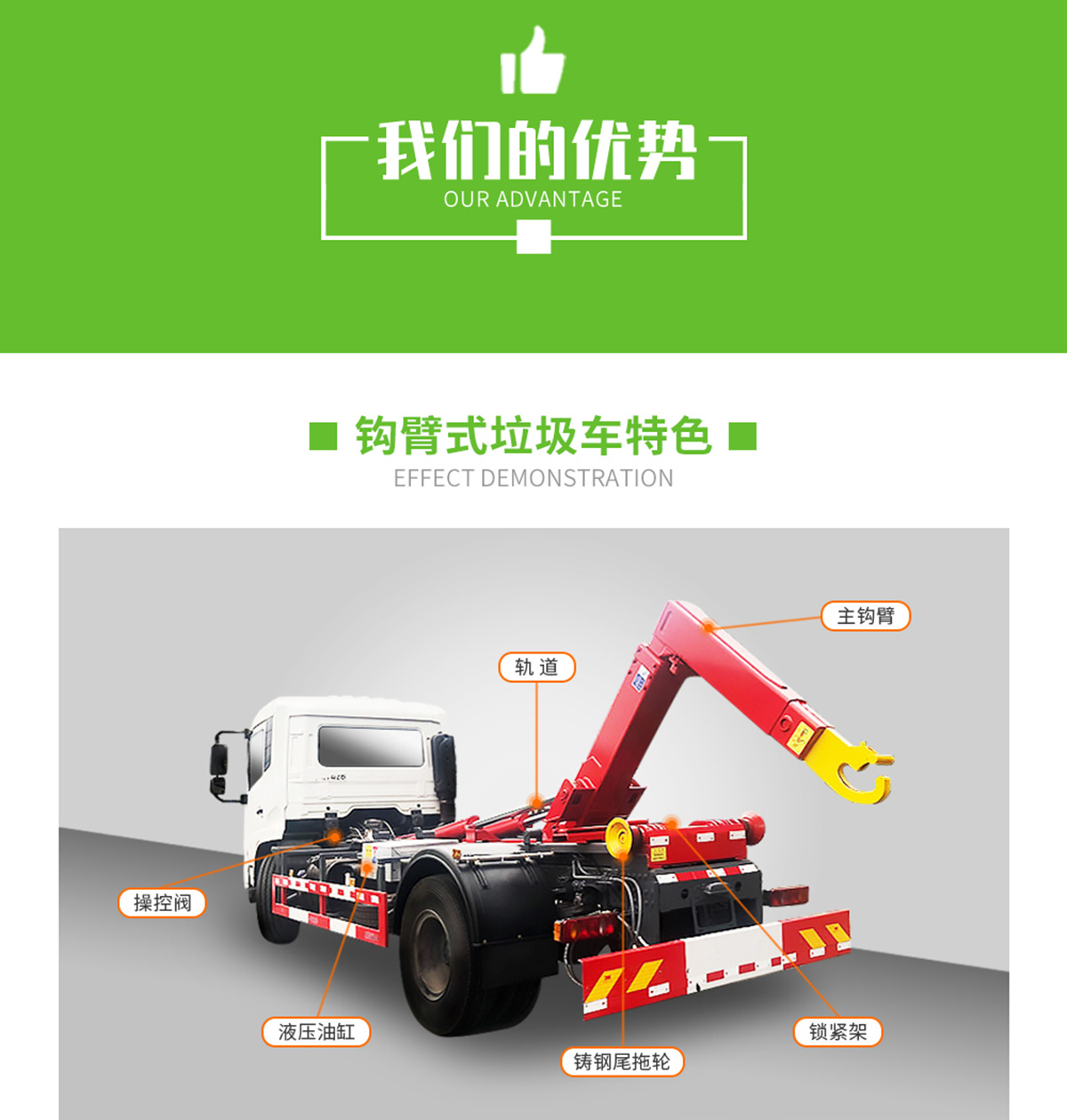 上裝配置:配套12~14方勾臂垃圾箱,主勾臂由高強度板材制作,雙油缸,國產多路閥,液壓油泵,標配駕駛室外部操作,可選裝駕駛室室內操作,選裝液壓后支腿,防誤操作,帶平衡閥,液壓鎖。